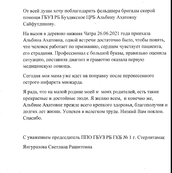 Хочу выразить свою сердечную благодарность и всей душой поблагодарить врача-педиатра участкового ГБУЗ РБ Буздякская ЦРБ Ильмиру Дамировну Юсупову и весь персонал детского отделения больницы, который участвовал в лечении моей малышки.